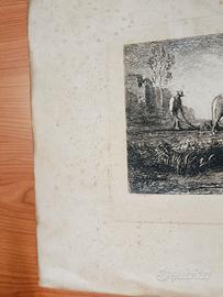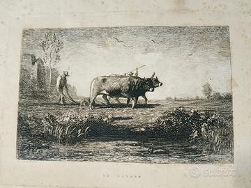 Antonio Fontanesi, incisione all'Acquaforte dal titolo "Il Lavoro" pubblicata nel 1873 in una cartella della Società Promotrice di Belle Arti Torino. Dimensioni foglio 43,3 cm x 31 cm, misure acquaforte 22,5 cm x 14,55 cm. Sono presenti segni del tempo (macchie dovute probabilmente all'umidità) sulla carta che non inficiano la bellezza dell'incisione. Spedito incorniciato ma senza vetro.