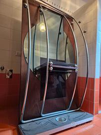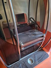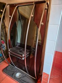 Questo particolare mobile è un appendiabiti o mobile da ingresso vintage (spesso definito "entratina"), tipico del design di modernariato degli anni '60 e '70. Struttura: È realizzato con un pannello in legno, arricchito da elementi curvi in acciaio cromato che fungono sia da decorazione che da supporto funzionale. Caratteristiche: Include uno specchio circolare centrale, una mensola (spesso in legno o vetro) e dei pomelli appendiabiti integrati nella parte superiore della struttura metallica. Stile: Il design condivide l'estetica di alcuni famosi designer dell'epoca, come Carlo de Carli (per Fiarm) o lo stile di Willy Rizzo, caratterizzati dall'uso del legno scuro (come il palissandro) abbinato a metalli lucidi. 💡 Suggerimenti per l'Arredamento Questo pezzo è ideale per chi ama lo stile Mid-Century Modern. Se desideri valorizzarlo, potresti: Abbinarlo a un'illuminazione d'atmosfera con lampade d'epoca in vetro soffiato. Posizionarlo in un ingresso spazioso per renderlo il punto focale della stanza. Attaccapanni di design dallo stile retrò o anni '80-'90. Misure in cm Altezza 180 Larghezza 100 Profondità 32