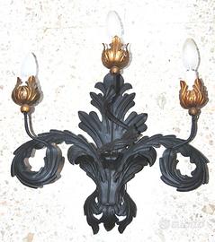 coppia di appliques antichi in ferro battuto con tre steli cadauno guarniti da foglie di acanto e corolle color oro . Perfettamente funzionanti e cablate lampadine escluse . Condizioni buone visibili a roma nord spedizioni ovunque