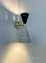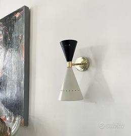 Particolari appliques anni’70 a biemissione, doppio cono interamente in ferro verniciato bianco e nero e base in ottone.
