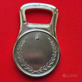 Apribottiglie vintage della maison Christofle in metallo argentato, collezione Gallia. Sul recto, un medaglione in rilievo con il profilo dell'imperatore Napoleone Bonaparte in stile neoclassico, coronato d'alloro. Sul retro, la corona d'alloro e un'ape - simboli imperiali napoleonici - e punzoni della manifattura "Christofle France" e "Coll. Gallia".