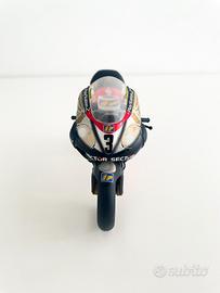 Modellino Diecast IXO Altaya in scala 1/12 dell'Aprilia RSV250 di Marco Melandri, campione del mondo stagione 2002 classe 250.