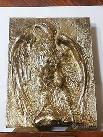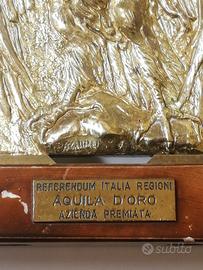 Vendo Premio Nazionale AQUILA D'ORO Referendum Italia Regioni. Il premio in oggetto veniva conferito alle Aziende italiane che si distinguevano nel proprio settore negli anni '70 e' 80. Si tratta di una placca di bronzo dorato fusa a cera persa del maestro scultore fiorentino Mario Pachioli. Dimensioni: 14,5x19x5 cm (esclusa la base).