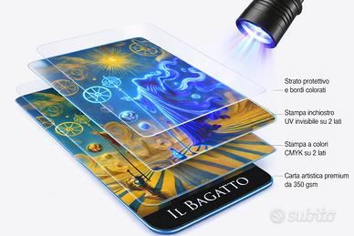 "Arcana Luminis" i Tarocchi del Surrealismo nascono dall’incontro tra la tradizione dei tarocchi classici e una visione artistica contemporanea ispirata al linguaggio surrealista. Ogni carta è progettata come un’opera simbolica, capace di parlare sia all’intuizione che alla conoscenza, offrendo più livelli di lettura e interpretazione. Il mazzo comprende 78 carte illustrate, con Arcani Maggiori reinterpretati in chiave visionaria e Arcani Minori che riportano alle origini storiche delle carte, fondendo i semi piacentini con quelli francesi. Un progetto pensato per la divinazione, la meditazione e lo studio del simbolismo. Questi tarocchi sono ideali per: letture intuitive e approfondite collezionisti di mazzi artistici appassionati di esoterismo e simboli antichi Ogni mazzo è frutto di ricerca iconografica, sperimentazione e cura artigianale, per offrire non solo uno strumento di lettura, ma un’esperienza visiva e simbolica unica. Ogni mazzo è realizzato con materiali di alta qualità e tecniche di stampa avanzate, pensate per valorizzare l’esperienza visiva e simbolica delle carte. Caratteristiche tecniche 78 carte illustrate Dimensioni: 70 × 120 mm, angoli arrotondati (R3.5) Carta artistica premium da 350 gsm Spessa e resistente, ideale per la lettura e la durata nel tempo Stampa professionale Stampa a colori CMYK su 2 lati Vernice UV protettiva Bordi colorati Inchiostro UV invisibile, visibile solo sotto Luce nera con lunghezza d'onda di 365 nm Confezione Box rigido per proteggere il mazzo