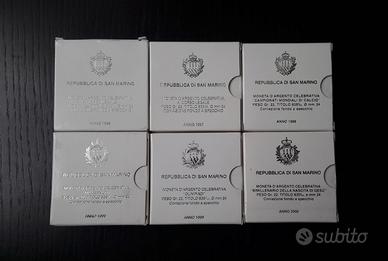 RSM _ Repubblica di San Marino _ FDC Moneta commemorativa del valore di 10.000 lire, finitura fondo specchio, condizione fior di conio _ 22 grammi di argento 835 equivalente a 18,37gr argento puro 1996 _ "San Marino guarda l'Europa" _ (*) (***) 1997 _ "Euro" _ (***) 1998 _ "Mondiali di calcio Francia" _ (***) 1998 _ "50 anni della Ferrari" _ ND 1999 _ "Olimpiadi del 2000" _ (*) (***) 1999 _ "Millennium" _ (*) (***) 2000 _ "1700 Fondazione della Repubblica" _ (*) (**) (***) 2000 _ "Giubileo" _ (*) 2000 _ "Bimillenario Nascita di Gesu" _ (*) (**) (***) 2001 _ "Network Camere di Commercio Mondiali" _ (ND) 2001 _ "Ferrari campione del Mondo 2000" _ (ND) (*) = moneta sfusa, senza capsula = 49 euro (**) = moneta con capsula in confezione con certificato e scatola, tutto originale = 50 euro (***) = moneta con capsula in confezione con certificato, scatola e controscatola, tutto originale = 51 euro (ND) = NON DISPONIBILE AL MOMENTO Dettagli, anni, patina del tempo e ottima conservazione come da foto ============================ PREZZO NON TRATTABILE (non fate offerte al ribasso, perdiamo tempo in 2) PAGAMENTO DIRETTAMENTE A ME (scrivetemi per istruzioni) ============================ Consegna a mano preferita (zona Rimni-Ancona): posso anche spedire scegliendo voi il tipo di spedizione e pagando me direttamente Disponibili anche altre monete di argento come 500 lire, Caravelle, Dante, commemorative, aquilini, scudi e scudoni, oncia oncie oz lingotto 999, Italia Regno, Kookaburra, Franchi Svizzeri e Francesi, scellini, marchi tedeschi, dollari USA e canadesi ... ecc ecc Per vedere le altre monete e lingotti in vendita cerca su Subito -> MAURORIMINI