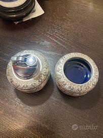 Accendino d’epoca lavorato a mano a firenze , finemente lavorato ogni pezzo si separa per diventare un posacenere finemente laccato in blu . Pezzo unico!! In questo caso il peso viene mostrato solo come ulteriore dato del opera in se . Prezzo?? Vediamo chi se lo aggiudica