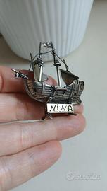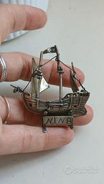 Pregiata miniatura realizzata in argento 800, raffigurante la Niña, una delle tre famose caravelle utilizzate da Cristoforo Colombo durante il viaggio del 1492.
