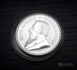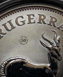 Moneta da 1 oncia (31,1 gr) di argento puro, fior di conio FDC, in capsula, anno 2017 con privy del 50 anniversario del Krugerrand.