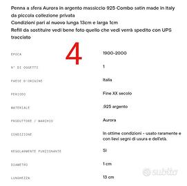 ARGENTO MASSICCIO 925 PENNA ROLLER AURORA VINTAGE. refill da cambiare. molto bella. scatola originale.
