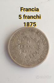 5 franchi moneta argento 900%° Francia anno 1875 .