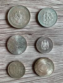 1 - Estados unidos Mexicanos Cinco pesos 1948 30 gramos ley 0.900 2 - Estados unidos Mexicanos un peso 1935 3 - 50 Shilling republik Osterreich 1974 4 - 5 Deutshe Mark 1977 Heinrich von kleist 5 - 5 Fr 1967 confederatio helvetica 6 - 50 shilling Republica Osterrrich 1924 - 1974 Rundfunk Numero 6 monete L.500 Republica Italiana tre caravelle anni 1966 - 1958 -1959 - 1961 e due 1960 Esattamente come da foto.
