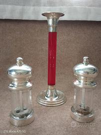 Una coppia di accessori sale e pepe in vetro e argento 925 e un piccolo portacandele in plexiglass rosso e argento di design.