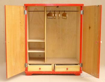 Armadio in legno a 2 ante per bambole, di ottima fattura, prodotto negli anni ’60 dalla ditta ZAX, colore rosso con decorazioni bianche sulle porte, 4 scomparti interni, 2 cassetti e asta orizzontale per appendere gli abiti, con 4 appendiabiti in legno. Dimensioni (cm): L45 x P25,5 x H55. Disponibile per la spedizione.