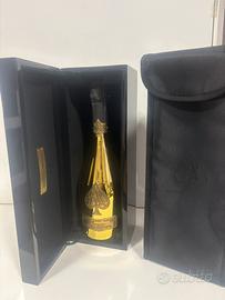 Prestigiosa bottiglia di Armand de Brignac Brut Gold, uno degli Champagne più iconici e lussuosi al mondo, riconoscibile per la celebre bottiglia dorata con simbolo Ace of Spades. Prodotto nella regione della Champagne (Francia) e presentato nel suo elegante cofanetto originale in legno laccato, completo anche della custodia protettiva originale.