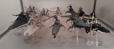 Armata Aeldari: 1x Eldrad Ulthran 1x Autarca 2x Stregone (Metallo) 1x Avatar vecchio (metallo, incompleto) 3x Spettroveggente (Resin) 20x Vendicatori Implacabili (Vecchio modello, plastica, basetta aggiornata) 30x Guardiani Difensori (Vecchio modello, plastica, basetta aggiornata) 3x Piattaforma arma pesante 6x Guardiani tempesta (con armi speciali) 10x Rangers (Vecchio modello, resina, basetta aggiornata) 9x Howling Banshees (Vecchio modello, metallo, basetta aggiornata) 5x Dark Reapers (Vecchio modello, resina, basetta aggiornata) 5x Dragoni del Fuoco (Vecchio modello, resina, basetta aggiornata) 2x Vypers 3x Hornets (Resina) 1x Wave Serpent 1x Falcon 3x Solcavelo 10x Jetbikes vecchie varie 2x Spettrocustode 1x Wraithseer (Resin) 1x Spettrocavaliere 3x Bipedi da Guerra 3x Arma di Supporto (Vecchio modello, metallo) Molte armi sono magnetizzate e fornisco le alternative Warhammer 40000 40K Xenos
