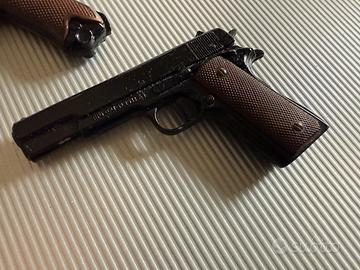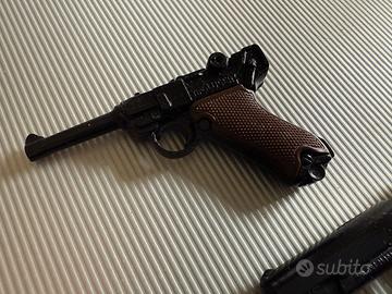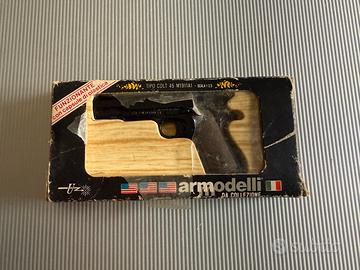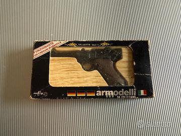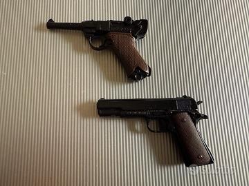 Modellini di pistole vintage anni 70 della Armodelli in scala 1:2,5. Meccanicamente funzionanti. Si tratta deila Luger P08 trdesca e della Colt 45 M1911A1 americana. Confezioni usurate dal tempo.