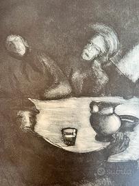 Puntasecca „LaCena“ del 1968 di Valerio Pisano, incisore, ceramista, pittore italiano, deceduto nel 1996. Vedi Wikipedia. Numerose le mostre nazionali e internationali a cui ha partecipato, così come sono numerose le Gallerie che espongono i suoi lavori.
