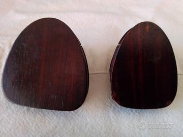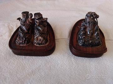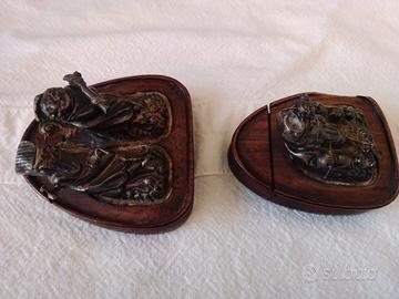 Rari amuleti orientali da collezionismo, di inizio 1900, in metallo argentato e legno, conservati molto bene. Con base in legno fessurata per inserirvi il nome della persona, i due oggetti sono caratterizzati da divinità orientali realizzate molto bene, in metallo argentato lucidabile.