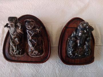 Rari segnaposto orientali da collezionismo, di inizio 1900, in metallo argentato e legno, conservati molto bene. Con base in legno fessurata per inserirvi il nome del commensale, i due oggetti sono caratterizzati da divinità orientali realizzate molto bene, in metallo argentato lucidabile.