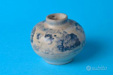 Antico e raro vasetto Vietnam Piccolo vaso in porcellana di Annam (antico Vietnam), risalente probabilmente al XV secolo. Prodotto in Vietnam sotto forte influenza cinese, famoso per le decorazioni in blu cobalto. Presenta una forma globulare con una decorazione dipinta a mano in blu sottosmalto. Spesso associato a ritrovamenti di relitti navali, questi manufatti venivano esportati in tutta l'Asia.