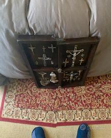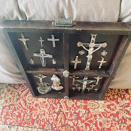 Collezione Di crocifissi d’epoca esposti in una scatola di legno suddivisa a scomparti