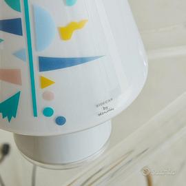 Presenta una decalcomania astratta/geometrica policroma denominata "VENTO" su un paralume a forma di fungo in vetro di Murano incamiciato con uno strato grigio perla esterno ed uno bianco latte interno. La base in plastica trasparente, che riporta tutte le informazioni dell'azienda ed il modello, si incastra a pressione all'interno del paralume.