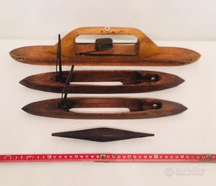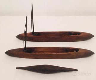 Antica Navetta per tessitura in legno, 2 Spolette da telaio e accessorio in legno.