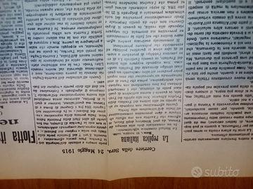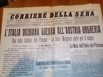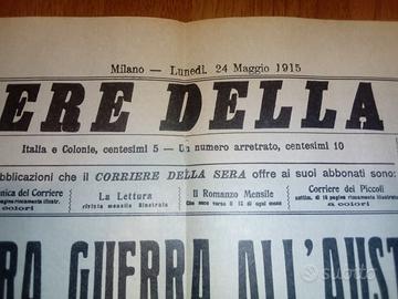 Rarissima prima pagina del corriere della sera, anno 1915, articolo "L'ITALIA DICHIARA GUERRA ALL'AUSTRIA-UNGHERIA", oggetto ben conservato e in perfette condizioni,