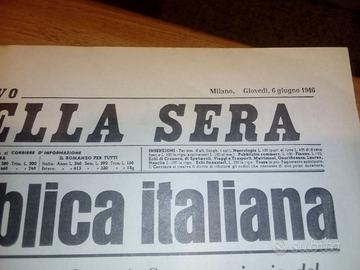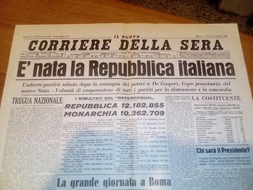 Rarissima prima pagina del corriere della sera, anno 1946, articolo "È NATA LA REPUBBLICA ITALIANA", oggetto Ben conservato e in perfette condizioni,