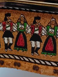 Originale e curato portagioie a forma di pianoforte. Interamente in sughero, con disegni di figure in abiti tradizionali sardi per tutta la lunghezza. Sempre in vetrina, mai utilizzato.