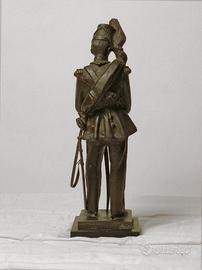 NOTIZIE STORICO CRITICHE:Il bronzetto è una copia in scala ridotta dell’ufficiale artigliere collocato sul monumento equestre di re Carlo Alberto di Savoia, eseguito tra il 1856 e il 1860 da Carlo Marocchetti (1805-1867) e posto nel 1861 sull’omonima piazza a Torino. Il monumento, assieme a varie figure allegoriche e bassorilievi celebrativi di vittoriose battaglie, rende difatti omaggio alle Forze Armate attraverso le sculture, poste sui quattro angoli, di altrettanti rappresentanti dell’Esercito Sardo. Il castello di Racconigi conserva copie di tutte e quattro gli ufficiali, tutte e quattro eseguite dalla ditta Fumagalli e Amerio di Torino.