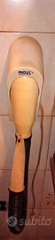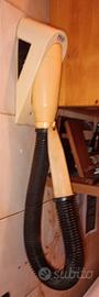 Anni 70, caratterizzato da un'unità principale fissata al muro che contiene il motore e la resistenza, collegata a un tubo flessibile estensibile che convoglia l'aria calda, si attiva staccando l'impugnatura dal supporto, offrendo una soluzione sicura e salvaspazio per ambienti pubblici o bagni piccoli.
