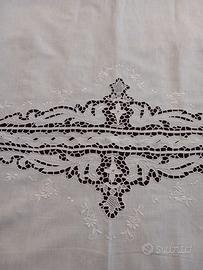 Il ricamo è presente su un lato, frutto di molte ore di lavoro artigianale, mentre l’altro lato è rifinito con orlo a giorno tradizionale.