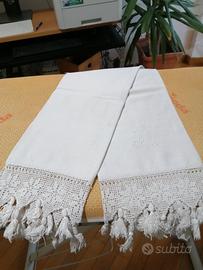Quelli della foto n. 1 e 2 sono due vecchi asciugamani in canapa tessuta a telaio in casa nei primi anni del 1900, dimensioni cm. 90 per 60 escluse le frange. Sono rifiniti con frange o pizzo all'uncinetto di semplice fattura ed iniziali A. U. Gli ultimi due(foto 3 e 4)sono due asciugamani in tela di cotone rifiniti da un alto bordo di pizzo fatto all'uncinetto con frange ed iniziali ricamate. Anche questi provengono da un corredo dei primi anni del 1900.