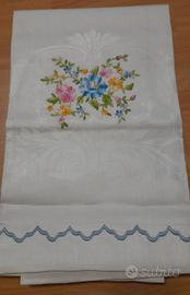 Set di sei asciugamani in tele pregiate firmate dalla manifattura Umberto Siletti & c. famiglia storicamente legata all'industria tessile del Biellese zona famosa nel mondo per la lavorazione di tessuti di alta qualità, per gli amanti della biancheria d'archivio e del vero made in Italy. Tessuto lucente tela di fiandra damascata con motivo jacquard floreale visibile in controluce, tessuto fresco e resistente. Ogni pezzo è impreziosito da un ricamo centrale a punto pieno con colori vividi e saturi, incorniciato da una raffinata finitura a smerlo colorato sul bordo. Dimensioni 64x108, mai usati conservati nella scatola originale quello con finitura rosa e uno con rifinitura ocra hanno due macchioline. Singolo asciugamano 16 euro, 2 pezzi 30 euro e il lotto completo con scatola 85 euro.