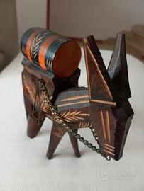 Asino in legno intagliato a mano, con barile sulla schiena e un secchio su entrambi i lati, vintage anni 70, misure nelle foto.