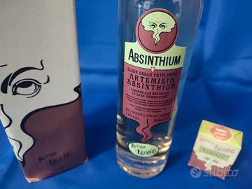 Confezione contenente una bottiglia da 50 cl. del mitico liquore Assenzio Leone e una scatolina delle storiche Pastiglie Leone all’assenzio.