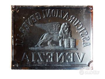 Vendo targa vintage in lamiera stampata a rilievo delle Assicurazioni Generali Venezia. La targa veniva applicata alla base delle facciate dei palazzi per evidenziare la copertura assicurativa in atto.