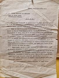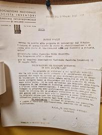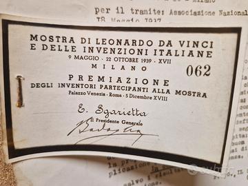 Copia ( del periodo) del parere su un brevetto ferroviario del 1938 più copia (sempre del periodo) della tessera della Mostra Di Leonardo Da Vinci e delle Invenzioni Italiane tenutasi a Milano nel 1939. La lettera è una "richiesta di raccomandazione" dell'autrice dell'invenzione riguardante il brevetto inviata a Badoglio. Segni del tempo e di usura (vedi foto che fanno parte della descrizione).