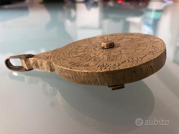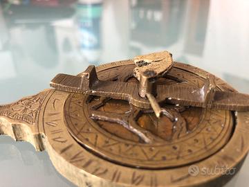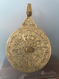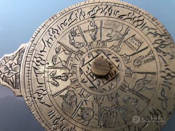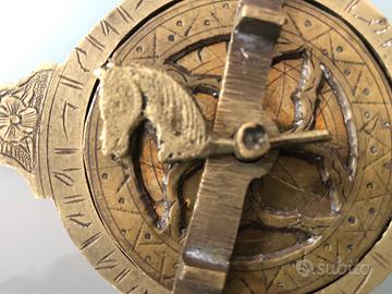 Antico astrolabio in ottone lavorato a mano. Lunghezza 10 cm. circa. Peso 230 grammi. Condizioni ottime come da foto.