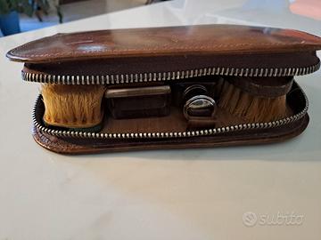 Astuccio in pelle da toilette; era di mio nonno, usato nel periodo militare anni '30/'40. E' completo di tutti gli accessori d'epoca: spazzole e pettine, specchietto, accessori in metallo e vetro, integri e in ottime condizioni, solo la fodera interna presenta segni dell' usura tempo nella piega.