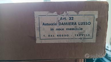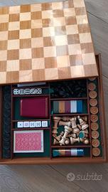Confezione lusso vintage in noce massiccio con giochi Dal Negro (scacchi, dama, due mazzi di carte, dadi con bicchiere, fiches). Mai utilizzato con scatola originale, completa di istruzioni originali, condizioni intonse. Dimensioni 34 x 34 cm.