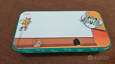 Astuccio in metallo Kinder Cioccolato con i personaggi di Tom & Jerry. Presenta una tabella pitagorica. - Design colorato con Tom & Jerry. - Materiale: metallo. - Tema: matematica e cartoni animati.