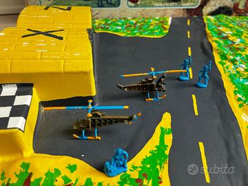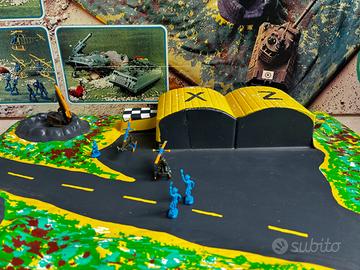 Vendo Super Plastico componibile originale Atlantic anni 70, Le Grandi Battaglie in scala H0 completo di scatola originale, con aeroporto, hangar, fortificazioni e bunker come da foto (misure cm 68 x 44). Il lotto comprende anche due set di soldatini Atlantic aviazione mezzi (n. 9014) e 8 soldatini della serie Atlantic Panzer Grenadieren (n. 51) come da foto. Il tutto in buone condizioni senza rotture o tagli a meno di un piccolo taglio, poi richiuso, sulla porta dell'hangar X come da foto.