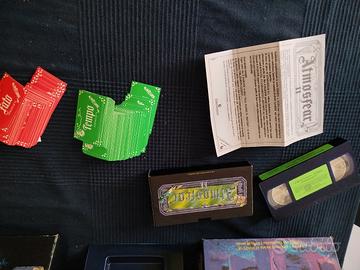 Atmosfear II il barone Samedi Zombie Clementoni con istruzioni foto copiate. Bellissima scatola con segni di usura quasi nulli e con angoli della scatola tutti integri. le carte sono state contate sono tutte presenti. sono in ottime condizioni, probabilmente mai usate punto è presente anche la videocassetta è la cover della videocassetta in originale Ma la videocassetta non è stata provata per mancanza di un registratore VHS. Purtroppo le istruzioni originali non sono presenti ma sono state sostituite da una fotocopia dall'originale, come da foto. per ulteriori informazioni o fotografie Basta chiedere appunto gioco in scatola di società da tavolo