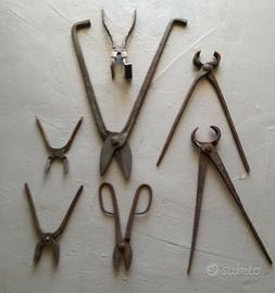 set di sette attrezzi da forgia (cesoie e tenaglie) in metallo provenienti dall'officina di un fabbro, anni '40-'50. Varie tipologie e misure. Le misure indicate fanno riferimento all'attrezzo più grande. Buone condizioni: c'è della ruggine ma sono tutti utilizzabili. misura 50 cm la piu' lunga.