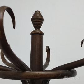 Appendiabiti vintage originale 1930 in legno scuro curvato progettato da Michael Thonet, pioniere nella tecnica della curvatura del legno mediante l'uso del vapore. Nella parte superiore l'appendiabiti presenta sei ganci doppi, mentre alla base è dotato di un portaombrelli