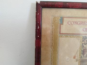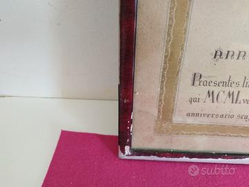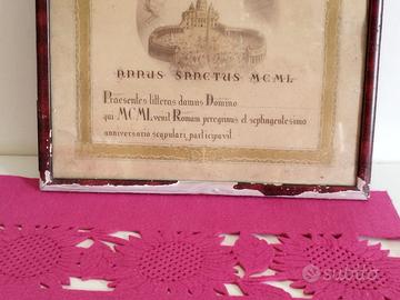 Ha bisogno di essere restaurato Raro documento illustrato d'epoca risalente all'Anno Santo MCML (1950). L’opera commemora il Congresso Mariano Carmelitano e il 700° anniversario dello Scapolare (1251-1951), celebrato con un anno di anticipo durante il Giubileo. Iconografia: Nella parte superiore è raffigurata la Madonna del Carmine che consegna lo Scapolare a San Simone Stock. Al centro, un medaglione con il ritratto di Papa Pio XII, lo stemma pontificio e una veduta aerea di Piazza San Pietro con la Basilica. Testo in Latino: Il documento riporta la dicitura "Praesentes litteras damus Domino... qui MCML venit Romam peregrinus...", confermando la partecipazione di un pellegrino alle celebrazioni romane. Dettagli Estetici: Cornice dorata stampata in stile neogotico/rinascimentale con fregi eleganti. Condizioni: Il documento cartaceo presenta i segni del tempo (ingiallimento naturale e alcune fioriture) che ne attestano l'autenticità. La cornice in legno bordeaux con venature presenta diffuse mancanze di colore e sbeccature, come visibile in foto, che conferiscono un carattere "vissuto" e vintage.
