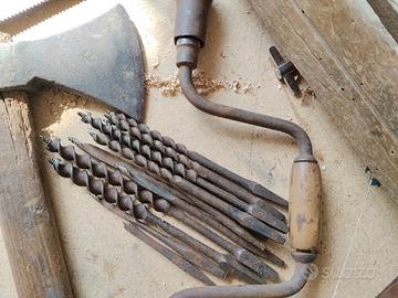 Cedo questi quattro utensili antichi per la lavorazione del legno. Comprese una decina di punte. Condizioni come da foto, strutturalmente integri ma con ruggine e fori di tarlo. Euro 7,00 attrezzi+punte Solo scambio a mano vicino Tortona AL