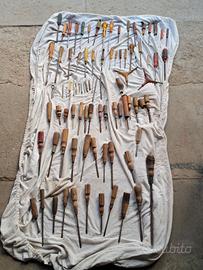 Una Falce, Una Morsa, otto Trapani vecchi a mano, circa 70 Cacciaviti vecchi piccoli, medi e grandi, tre Pesi per bilancia Bascula: tre da 5 kg - 1 da 2 kg - 1 da 1 kg; due Incudini Battifalce. Il prezzo dipende dall'articolo e si preferisce vendere tutto in blocco.